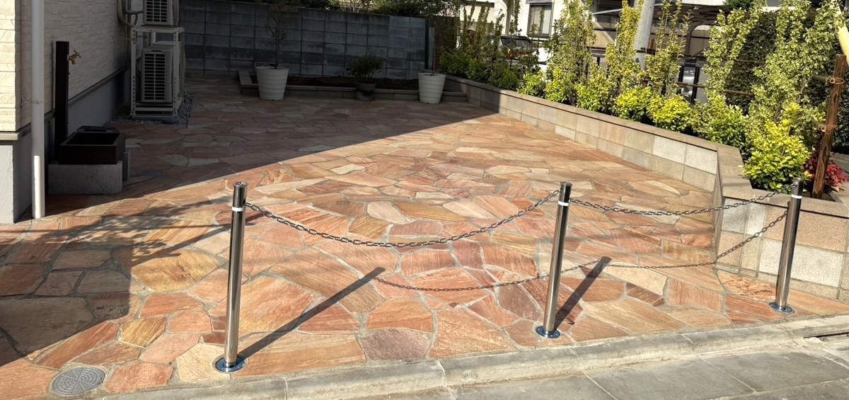 駐車場にも乱石を大胆に敷き込み、外構全体を上質な印象へと引き上げています。